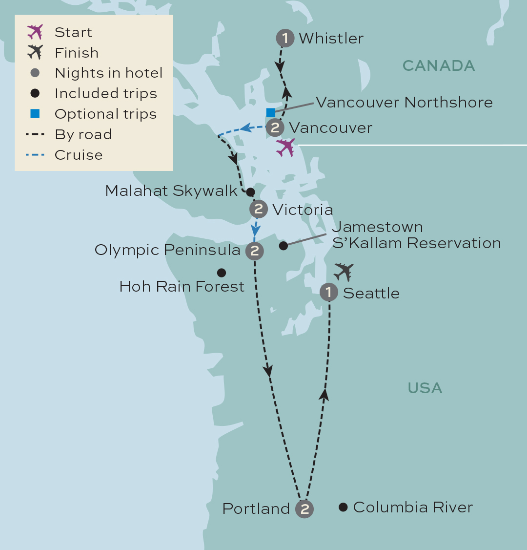 This extraordinary Pacific Northwest journey invites you to experience landscapes so dramatic they'll leave you breathless. Your adventure begins in cosmopolitan Vancouver, where we'll discover vibrant neighbourhoods before ascending to alpine Whistler and charming Victoria on Vancouver Island. A scenic ferry transforms our border crossing into a memorable voyage as we glide into Washington State's Olympic National Park – one of North America's most diverse ecosystems, where every trail reveals wonders from hot springs to glacier-carved valleys. Portland welcomes us with its famous craft culture, perfectly positioned for exploring the majestic Columbia River Gorge, where waterfalls cascade through ancient basalt cliffs. We'll also stand at Mount Hood's viewpoint and witness the snow-capped peak that has inspired generations. Our journey culminates in Seattle's iconic Pike Place Market, where freshly roasted coffee aromas mingle with fishmongers' calls – here we'll walk in the footsteps of the coffee revolution that conquered the world.