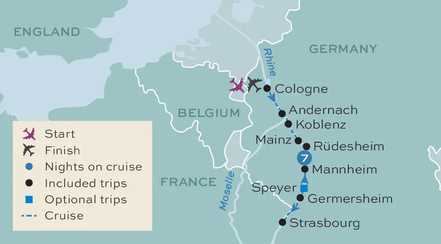 Meals included: BThe large panoramic windows of the Rhein Symphonie makes it perfect for enjoying the views of 'Father Rhine'. The vast sun deck is perfect for relaxing and taking in the panorama before heading down for a drink in the light and airy salon and bar. The large restaurant serves international and regional specialities. The cabins are approx. 14.5 m² in size and are stylishly and comfortably furnished with individually adjustable air-conditioning/heating, private facilities, satellite TV, telephone, hairdryer and safe. The main deck cabins have windows that do not open. Main deck aft cabins are approx. 11.5 m² in size with windows that do not open, have a single fold-out bed and sofa bed. Your holiday price is based on a main deck cabin. The cabins on the middle deck have large panorama windows that open. All upper deck cabins have floor-to-ceiling panorama windows that open (French balcony). Cabin upgrades are available, please call and speak to one of our Holiday Advisors.