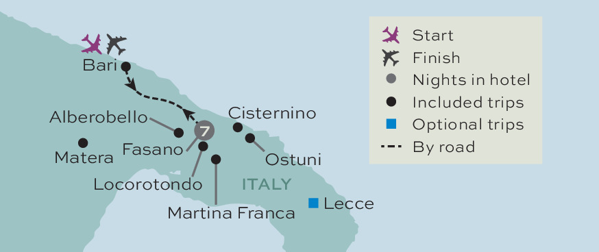 The fascinating Valley of Itria presents plenty of opportunities to see the attractive Trulli houses that epitomise the region. Cylindrical in shape and topped by a conical roof, these ancient buildings line the streets of Alberobello, one of the towns we visit today. We will also discover the narrow lanes and whitewashed buildings of Martina Franca, an evocative town filled with medieval palaces, churches and balconied houses.