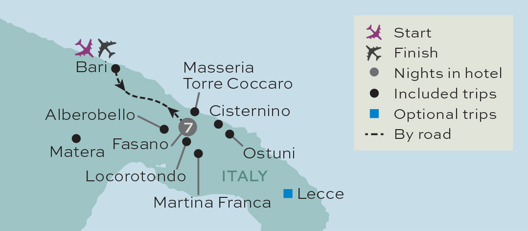 You've a free day today to relax at the hotel. This evening, if you'd like to experience the Italian way of life, be sure to join our optional excursion to Monopoli. Departing late afternoon, we'll drive to Monopoli, a pretty coastal town with a delightful medieval centre and seafront promenade. It's the perfect place to enjoy an aperitif and well known for the Baroque Monopoli Cathedral featuring a tall bell tower. You'll have free time here to explore and enjoy dinner in one of the inviting little restaurants. You could even treat yourself to some delicious ice cream for dessert!