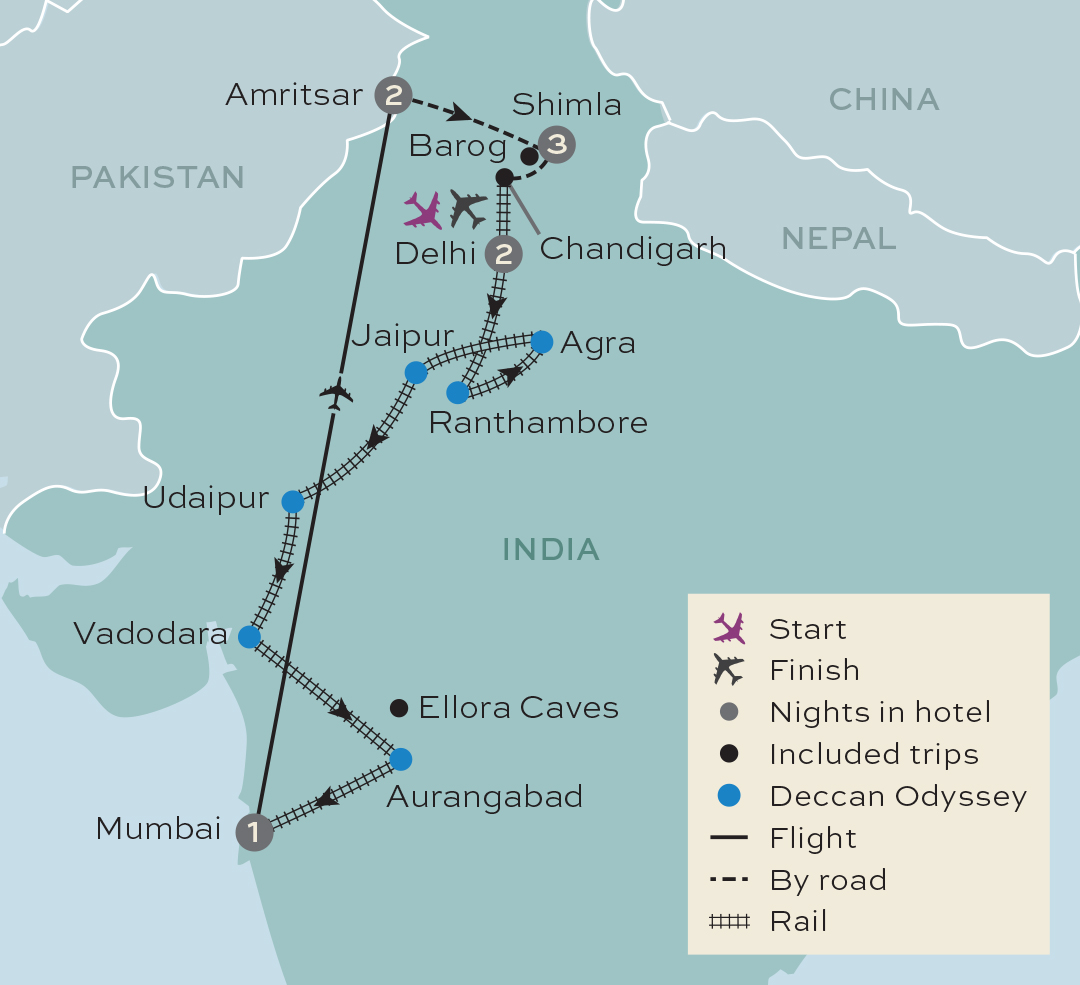 The ultimate way to explore India's Golden Triangle, Rajasthan, Amritsar and Shimla. We fly to Delhi, where we will start our explorations with a tour of New and Old Delhi, before joining the incredible luxury heritage train - Deccan Odyssey. Our 2025 departure is exclusively chartered for Just You in celebration of our 25th anniversary! We stay on board for 7 nights, and en-route experience Agra, Ranthambore, Jaipur, Udaipur and Ellora Caves, its the perfect way to tour without packing and unpacking. We end in Mumbai, India's largest and most vibrant city, home of Bollywood and much more, then travel onto Amritsar to see the Golden Temple by night and day and lastly explore the hill station resort of Shimla.