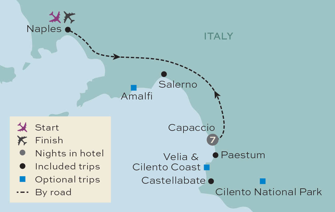 Less well-known than its neighbour, the Amalfi Coast, the whole Cilento area is swamped in history and is listed as a UNESCO World Heritage Site. After breakfast, we'll start our explorations as we head off on an included excursion to the medieval town of Castellabate. Located high on a hill, from here we'll admire fantastic views across the countryside and out to sea, and enjoy a walk through the arches and passageways of the town centre. Later, enjoy a relaxing lunch at a vineyard.