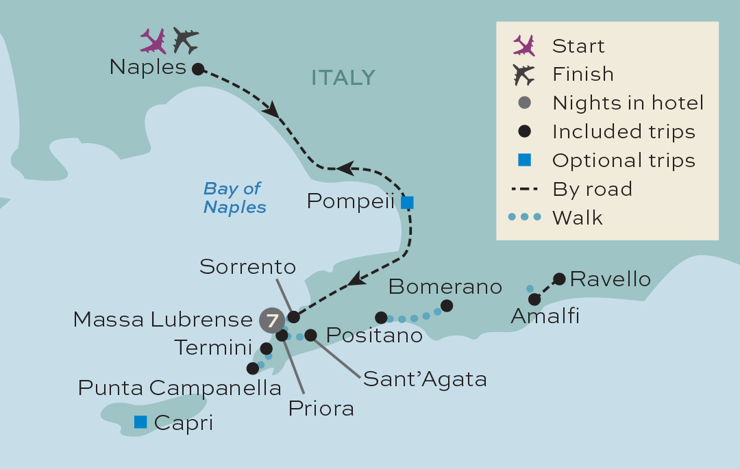 After a while, we'll reach the remote village of Nocelle, which is inaccessible by car or bike. We'll pause to watch the small cable cars bringing goods to the village from the main road below, and then carry on to the small town of Montepertuso. There will be time to explore and enjoy lunch here if you wish. It's then just a short walk down a steep staircase into Positano, but be warned, there are so many photo opportunities on the way, it could take us sometime to reach the village! Take the weight off your feet and enjoy a well-earned drink, relax on the beach or explore Positano at leisure – the choice is all yours before we return to the hotel by coach.